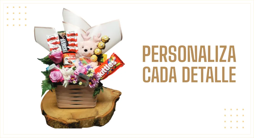 personalizamos arreglos florales añadiendo peluches, dulces, frutas o cualquier otro elemento deseado para hacer tus arreglos un detalle aún más especial.